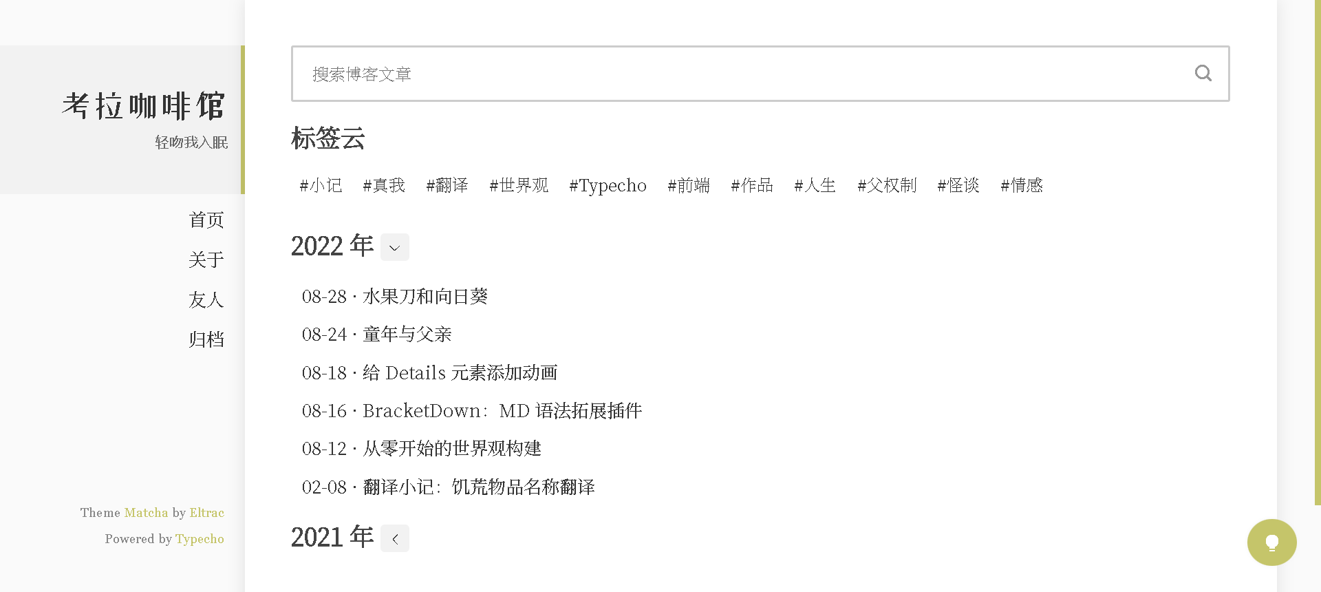 选择这个模板,你在编辑器内输入的内容将不会显示。取而代之的是, 页面将会展示博客的所有标签和文章,文章按年份划分,较旧年份的文章列表会被折叠, 同时也会有一个供用户搜索博客内容的搜索框。